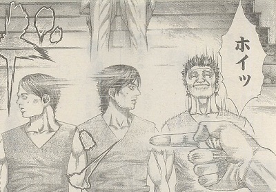 「あんな謎の立会人とかいうじいさん連れてきて・・・」「あんたら・・・一体この島に何しに来たんだ?」貘さんは「ある人物と どっちがカイザーになれるか賭けをしに来た」と直球な返答。
